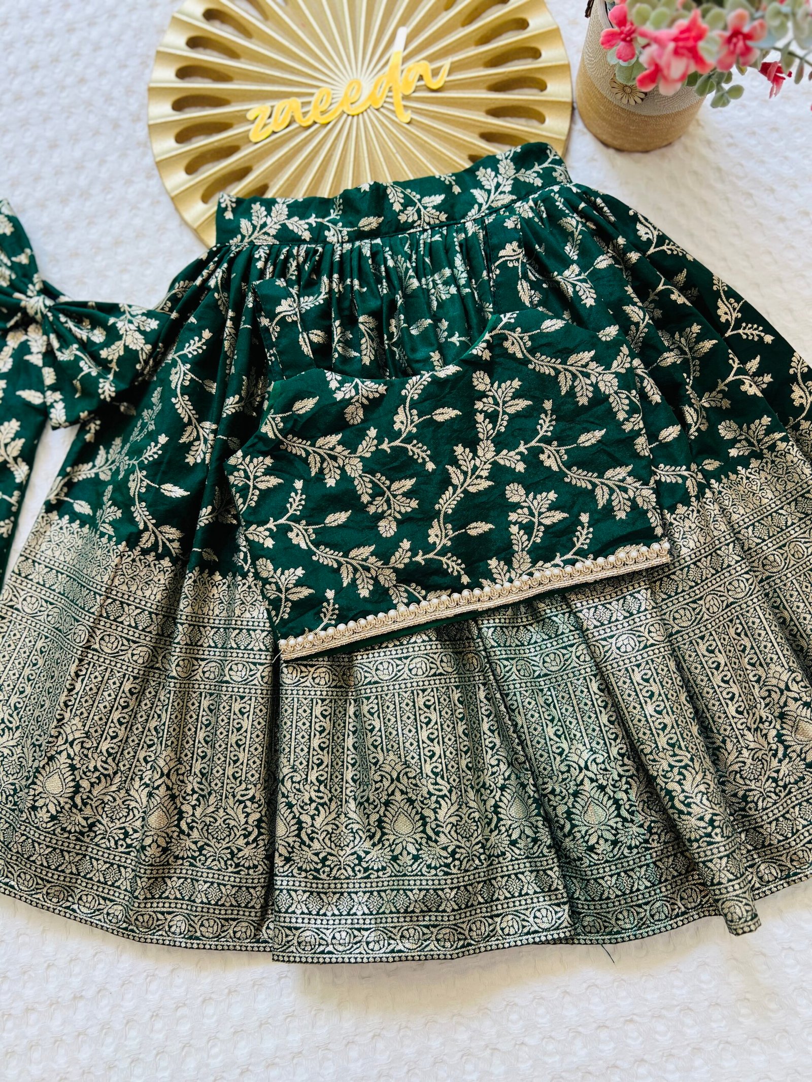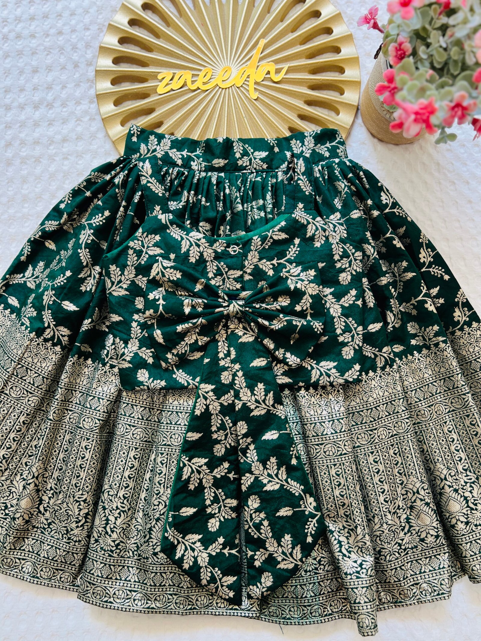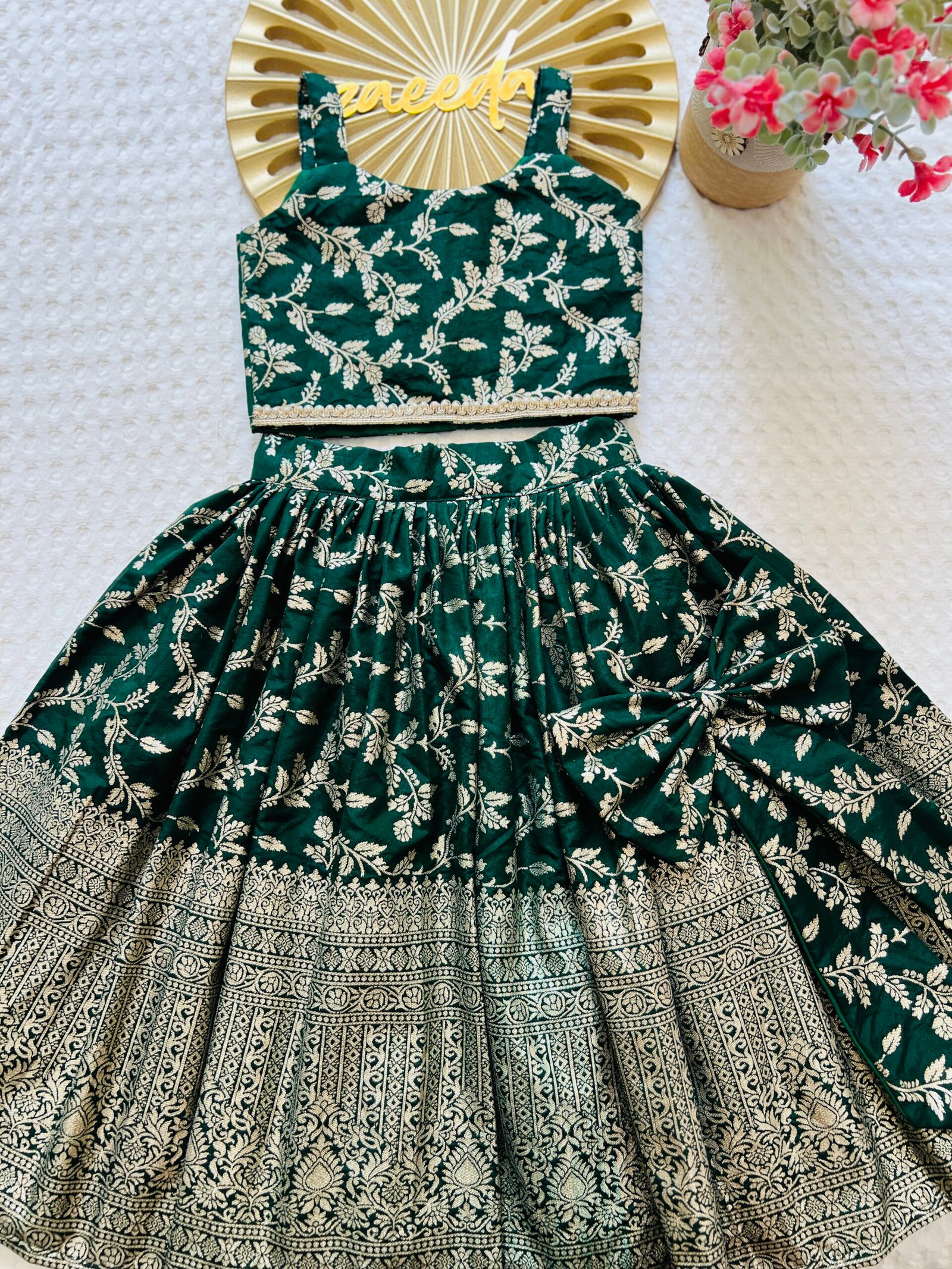 CHANDERI SILK GREEN AND RANI ,BLACK PINK SKIRT & TOP