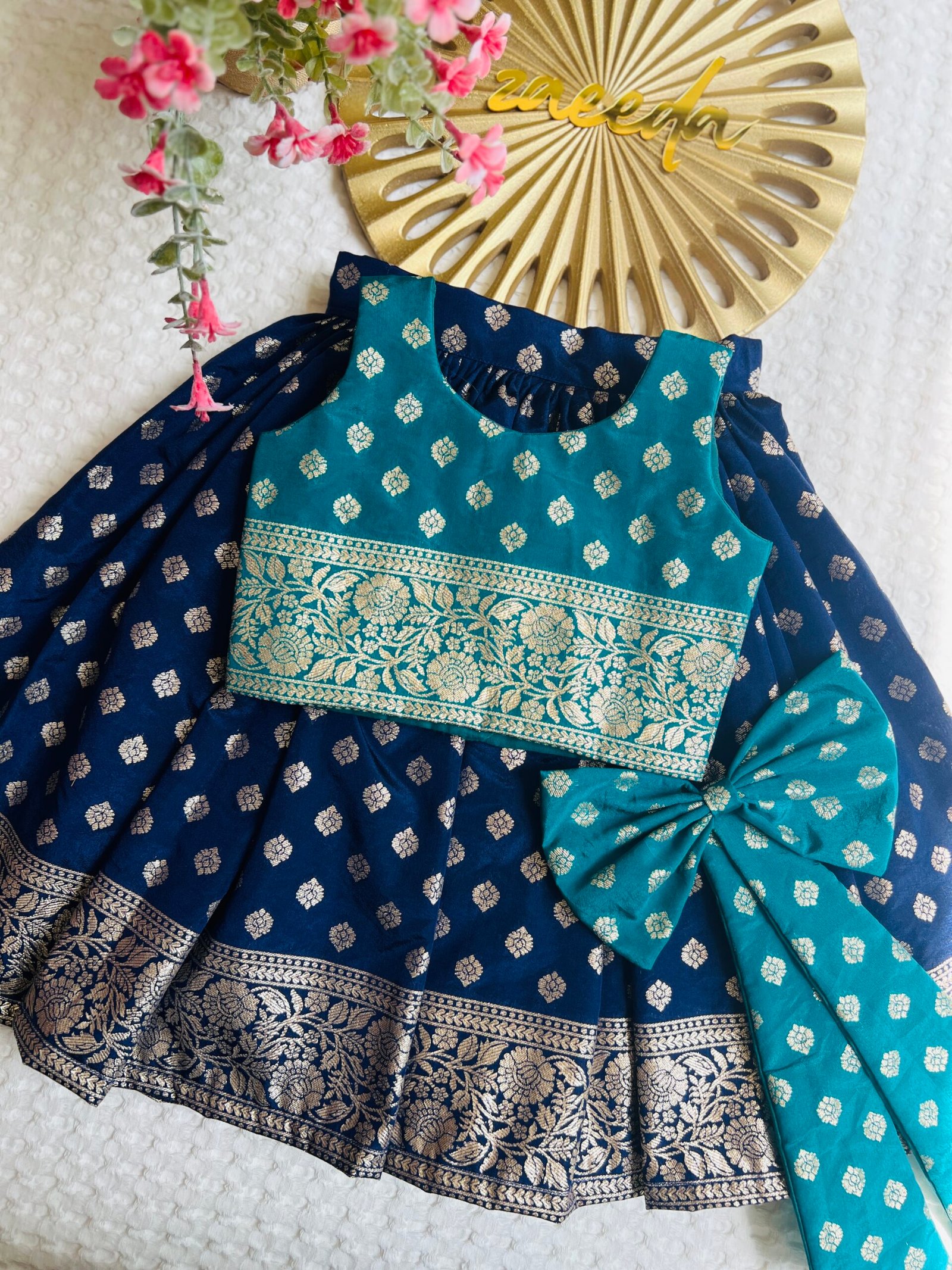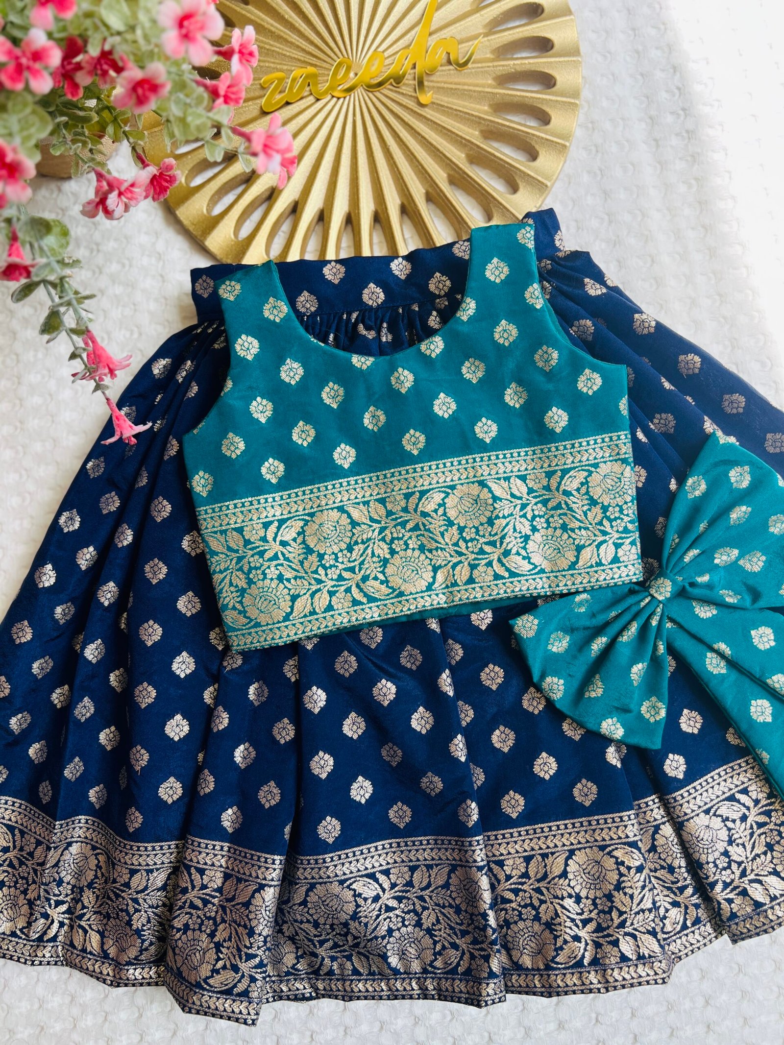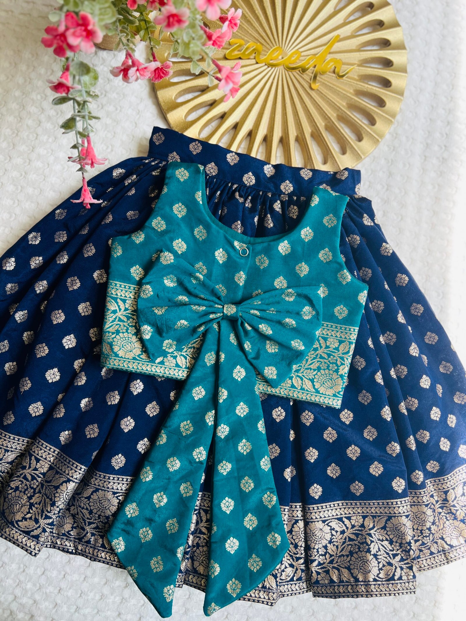 CHANDERI SILK NAVI BLUE AND PEACOCK GREEN SKIRT AND TOP