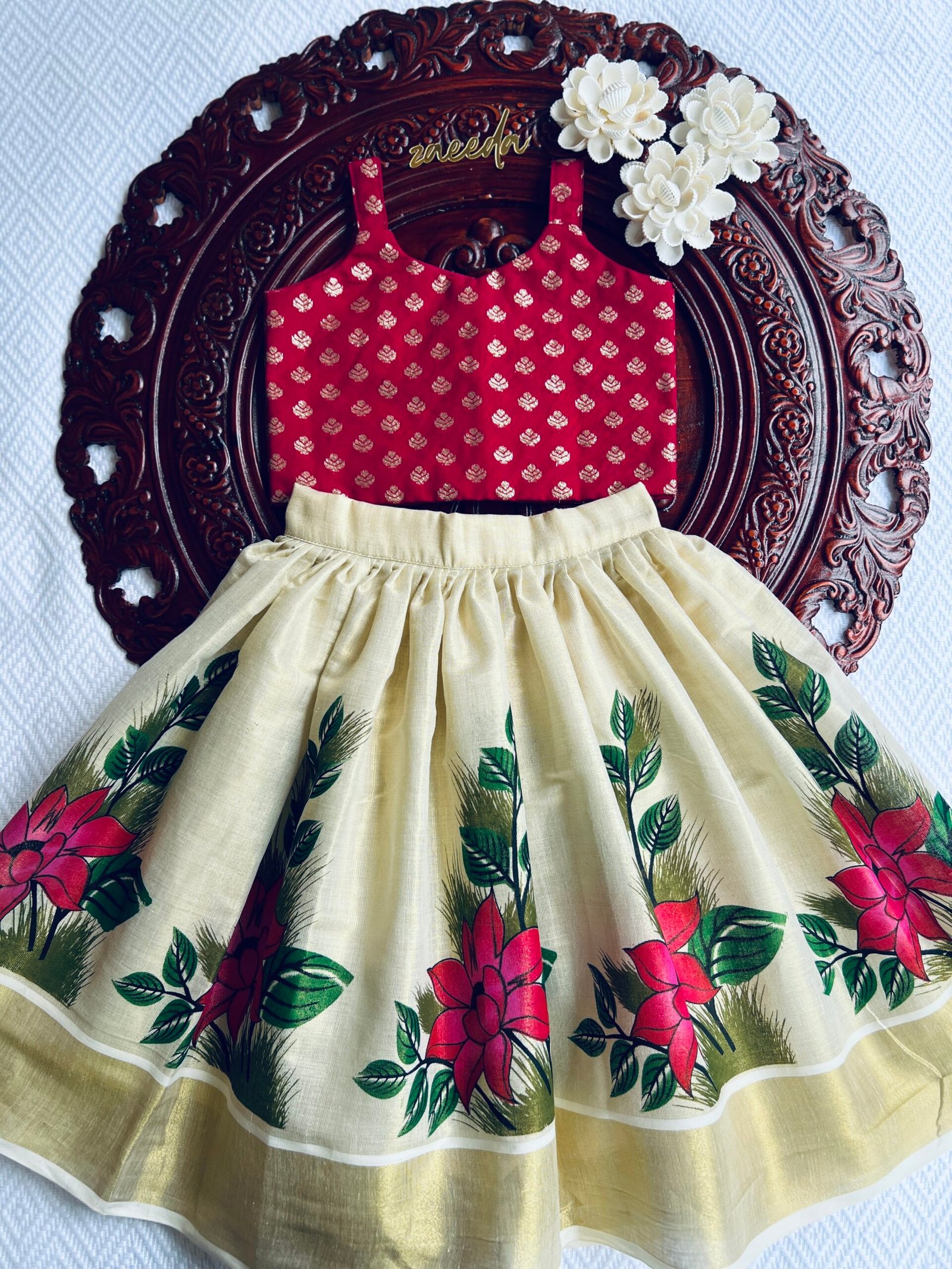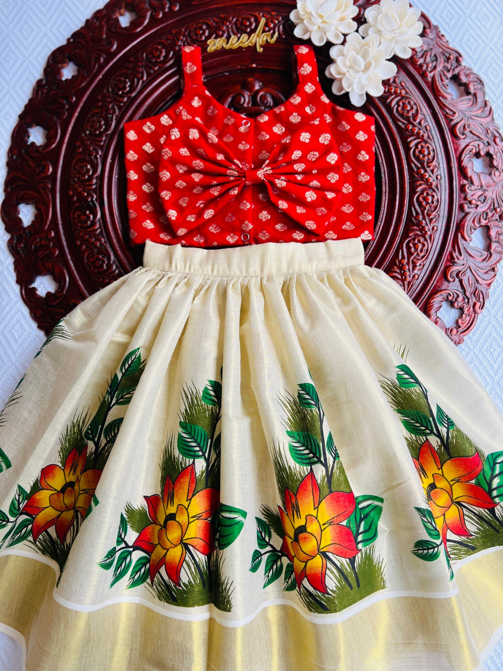 Be the first to review “TISSUE SILK LOTUS RED & PINK PATTUPAVADA”
